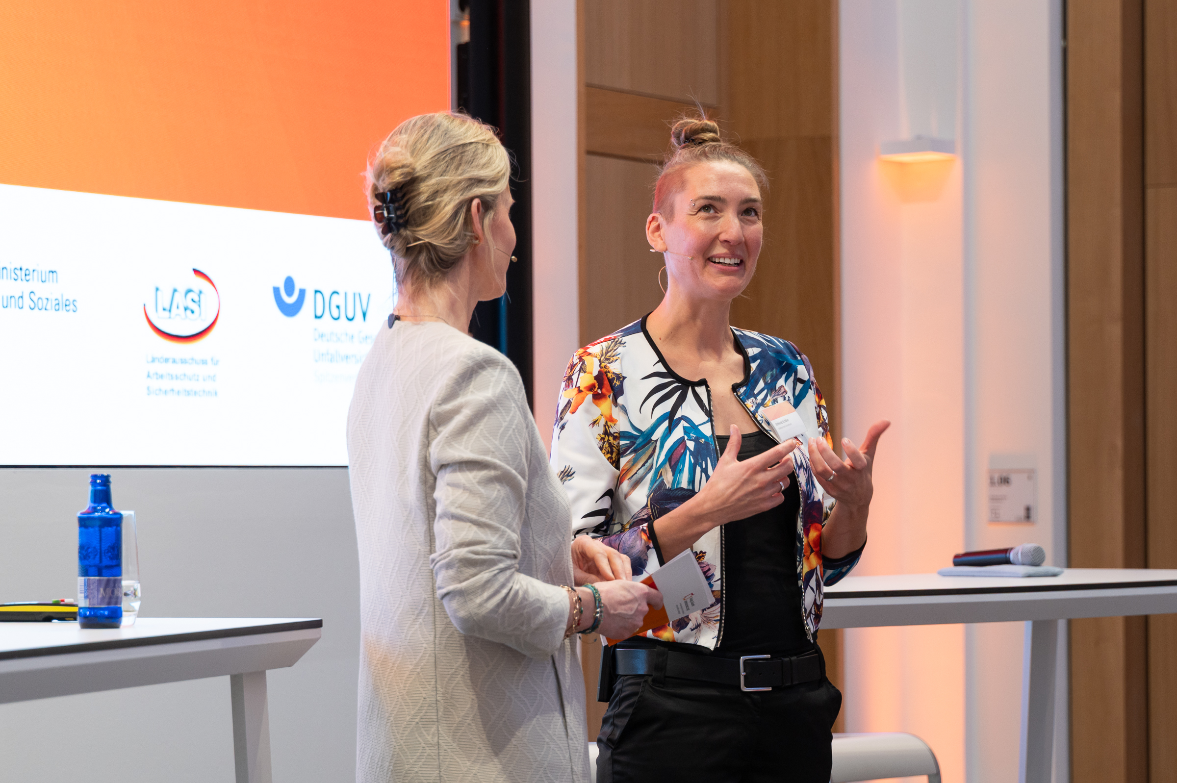 Moderatorin Corinna Lampadius und Keynote-Speakerin Dr. Stefanie Schöler beim "Dialog Zukunft Arbeitsschutz 2025" (Foto: DASP/J. Konrad Schmidt) Download Bild: Moderatorin Corinna Lampadius und Keynote-Speakerin Dr. Stefanie Schöler unterhalten sich auf der Bühne beim "Dialog Zukunft Arbeitsschutz 2025" -