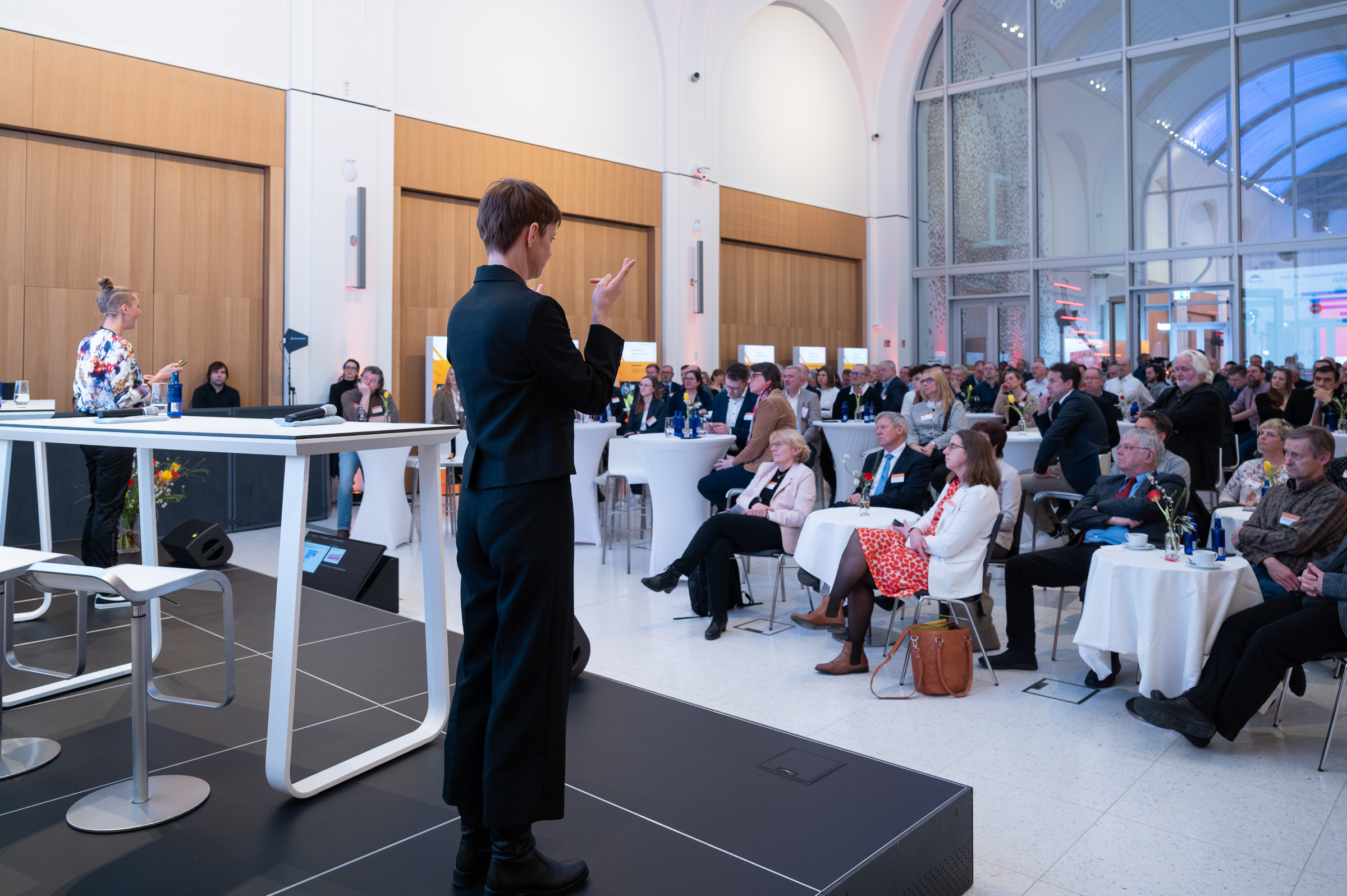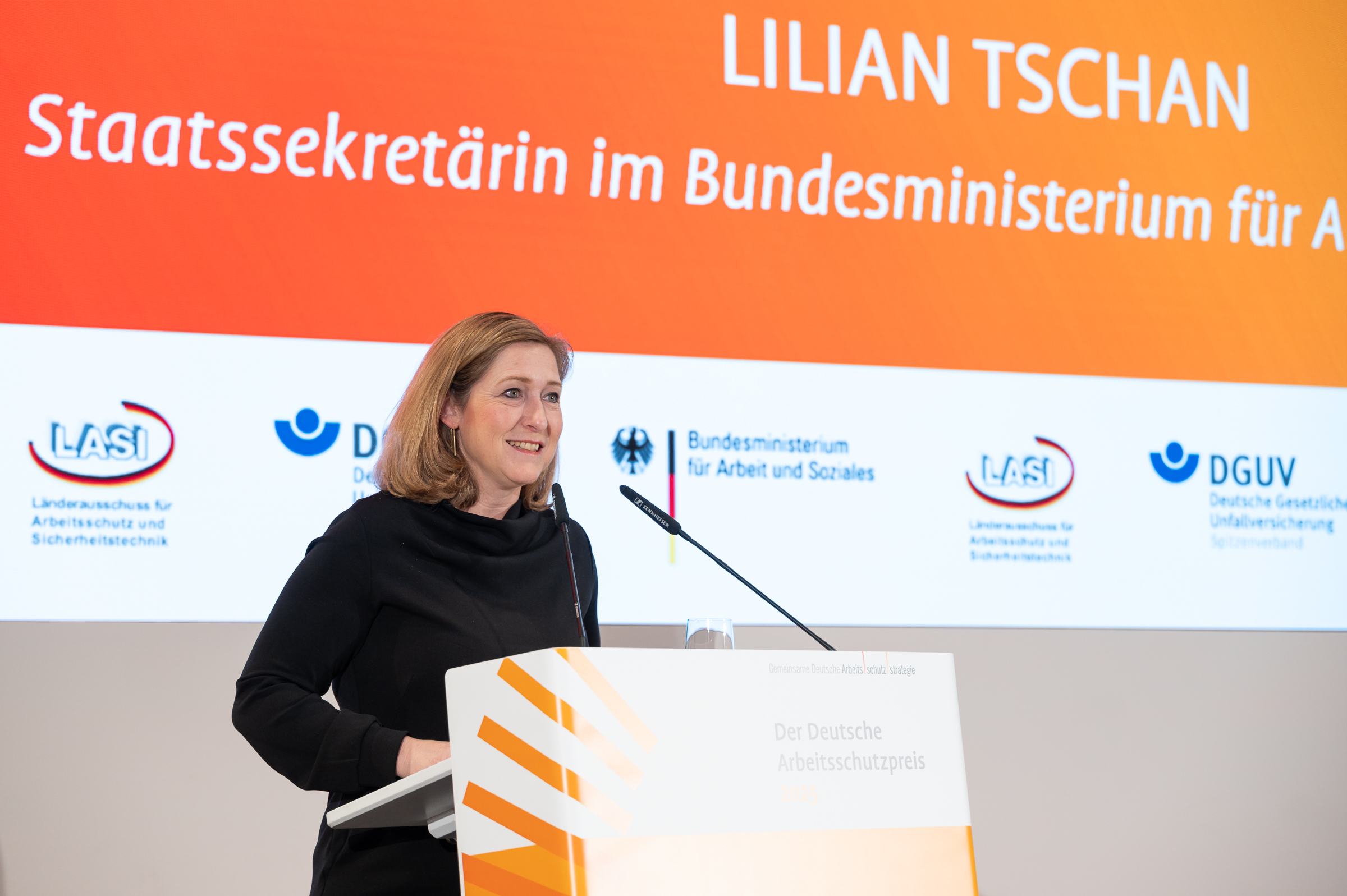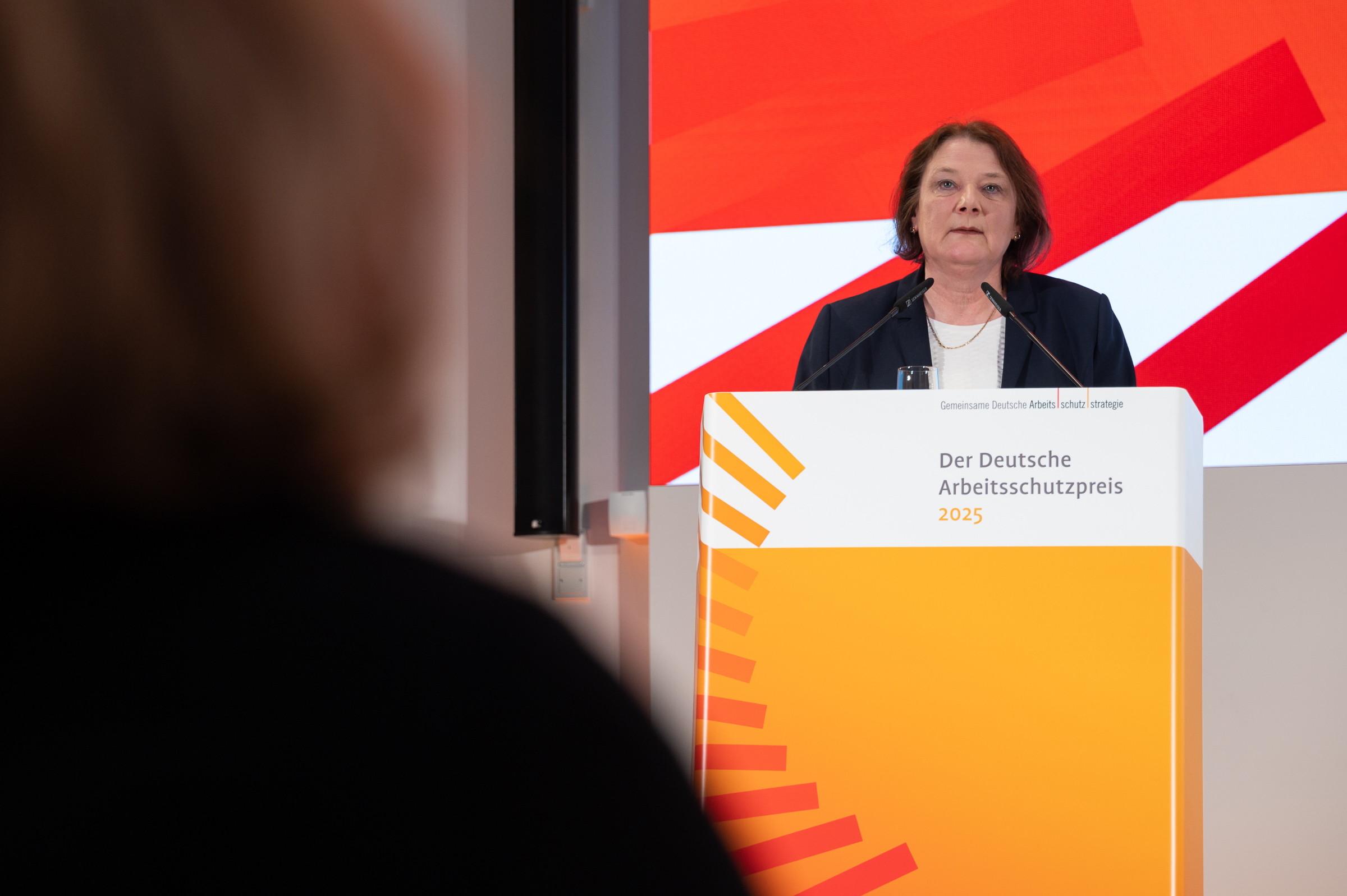 Laudatio in der Kategorie "Betrieblich" durch die LASI-Vorsitzende Sabine Majehrke (Foto: DASP/J. Konrad Schmidt) Download Bild: Sabine Majehrke, die Vorsitzende des LASI, hält am Pult die Laudatio in der Kategorie „Betrieblich“. -