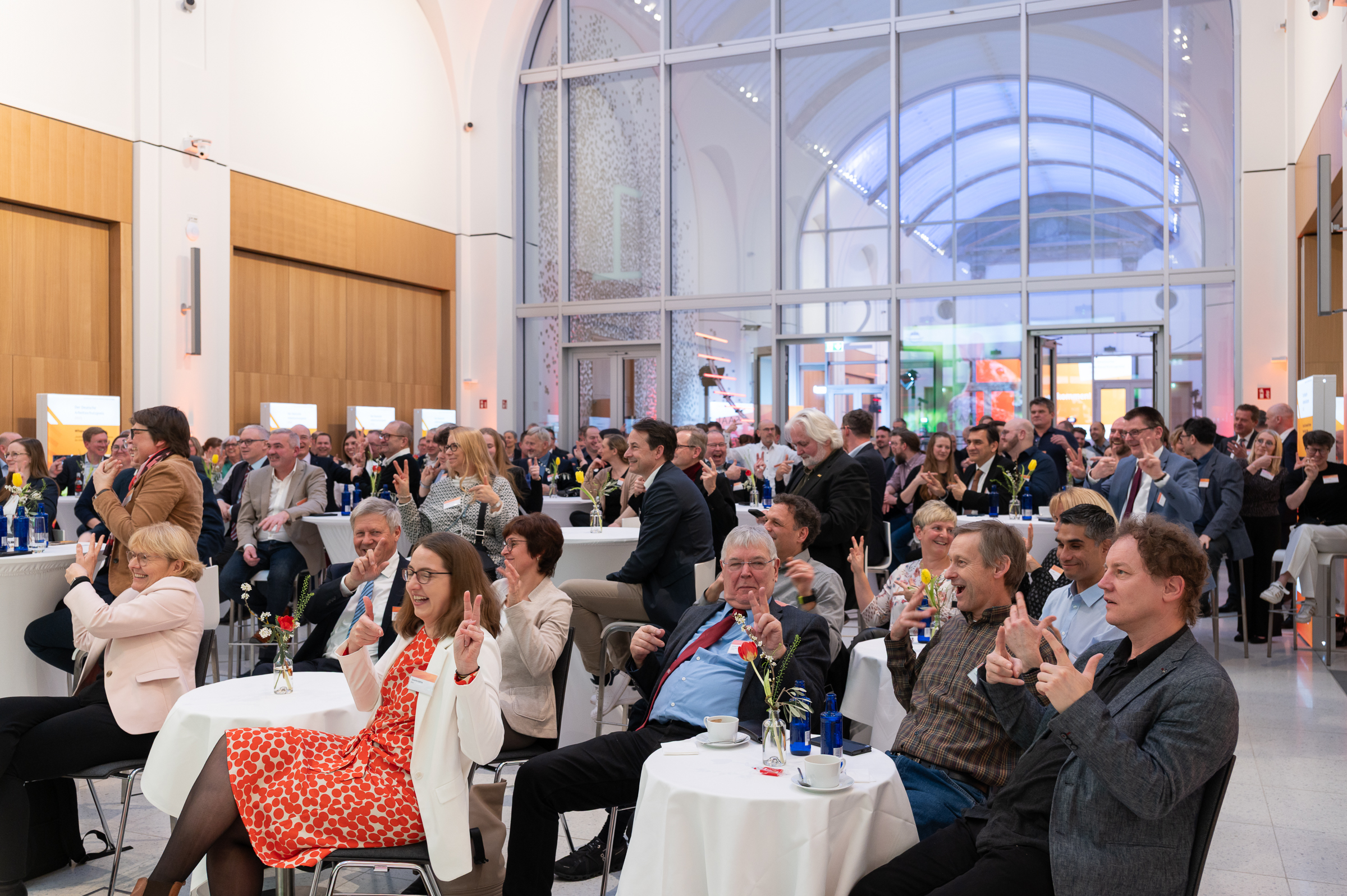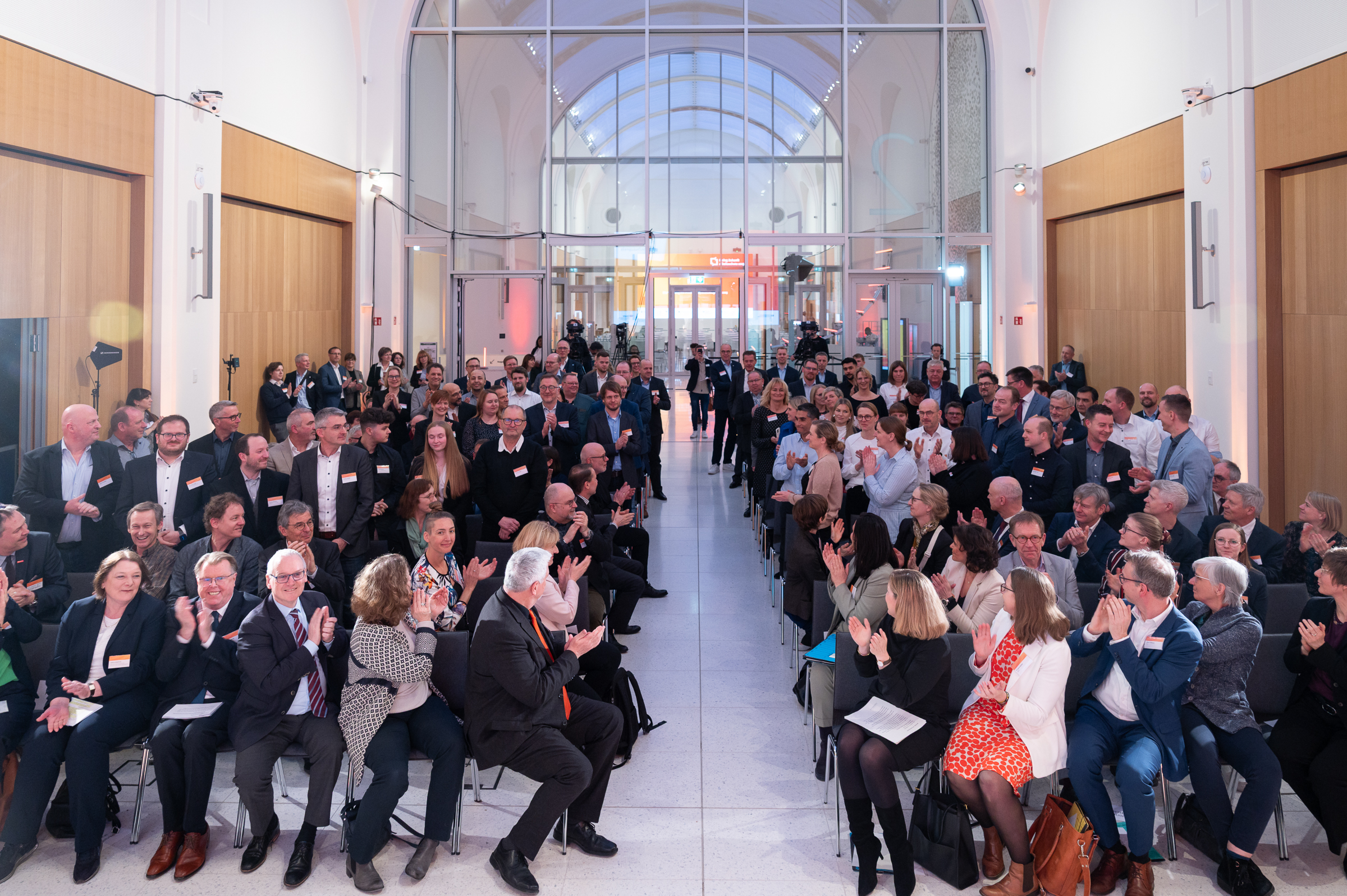 Publikum applaudiert den Nominierten des Deutschen Arbeitsschutzpreises 2025 (Foto: DASP/J. Konrad Schmidt) Download Bild: Applaudierendes Publikum im Veranstaltungssaal, die Nominierten stehend. -