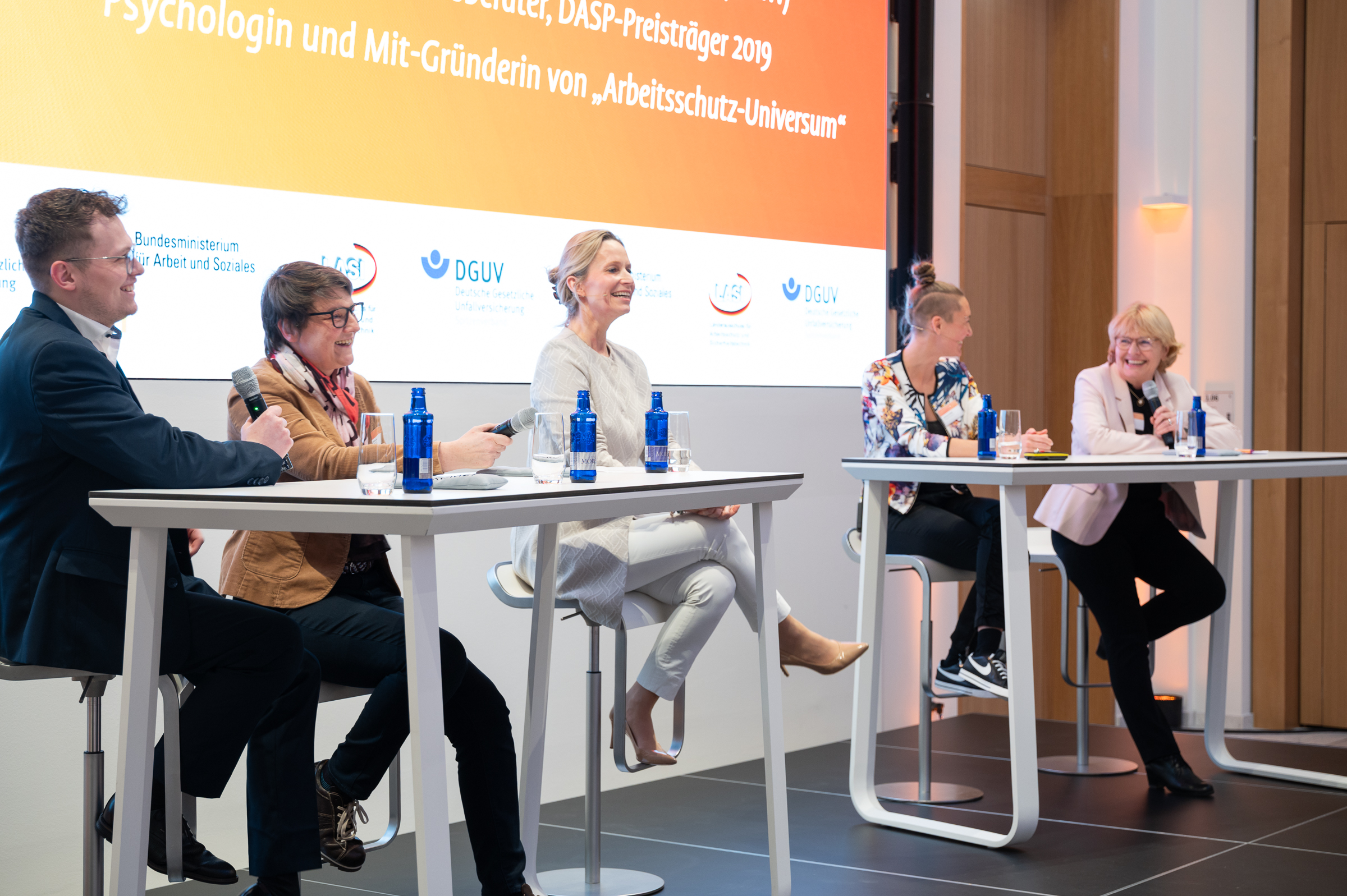 Podiumsdiskussion mit Felix Röwekämper, Michaela Kanthak, Corinna Lampadius, Prof. Dr. Antje Ducki, Dr. Stefanie Schöler (v.l.n.r. ) beim "Dialog Zukunft Arbeitsschutz 2025" (Foto: DASP/J. Konrad Schmidt) Download Bild: Bühne mit vier Protagonisten für die Podiumsdiskussion beim "Dialog Zukunft Arbeitsschutz 2025" -