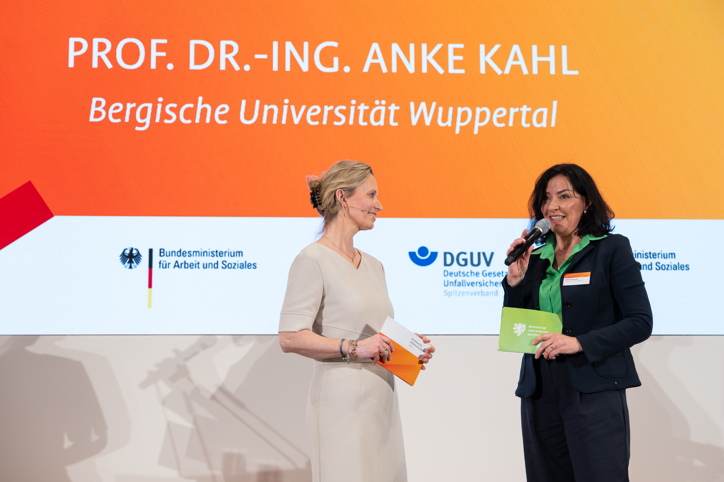 Moderatorin Corinna Lampadius mit Laudatorin Prof. Dr.-Ing. Anke Kahl, Inhaberin des Lehrstuhls für Arbeitssicherheit an der Bergischen Universität Wuppertal (Foto: DASP/J. Konrad Schmidt) Download Bild: Die Moderatorin lächelt die Laudatorin an, die ein Mikrofon in der Hand hält. Beide stehen auf einer Bühne in festlicher Kleidung. -