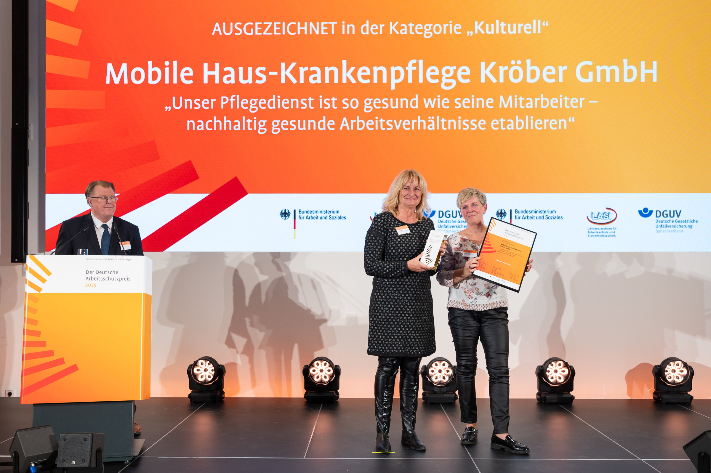 2025 ausgezeichnet in der Kategorie "Kulturell": Mobile Haus-Krankenpflege Kröber GmbH mit Laudator Volker Enkerts, amtierender Vorstandsvorsitzender der DGUV (Foto: DASP/J. Konrad Schmidt) Download Bild: Vertreterinnen des ausgezeichneten Unternehmens mit Laudator -