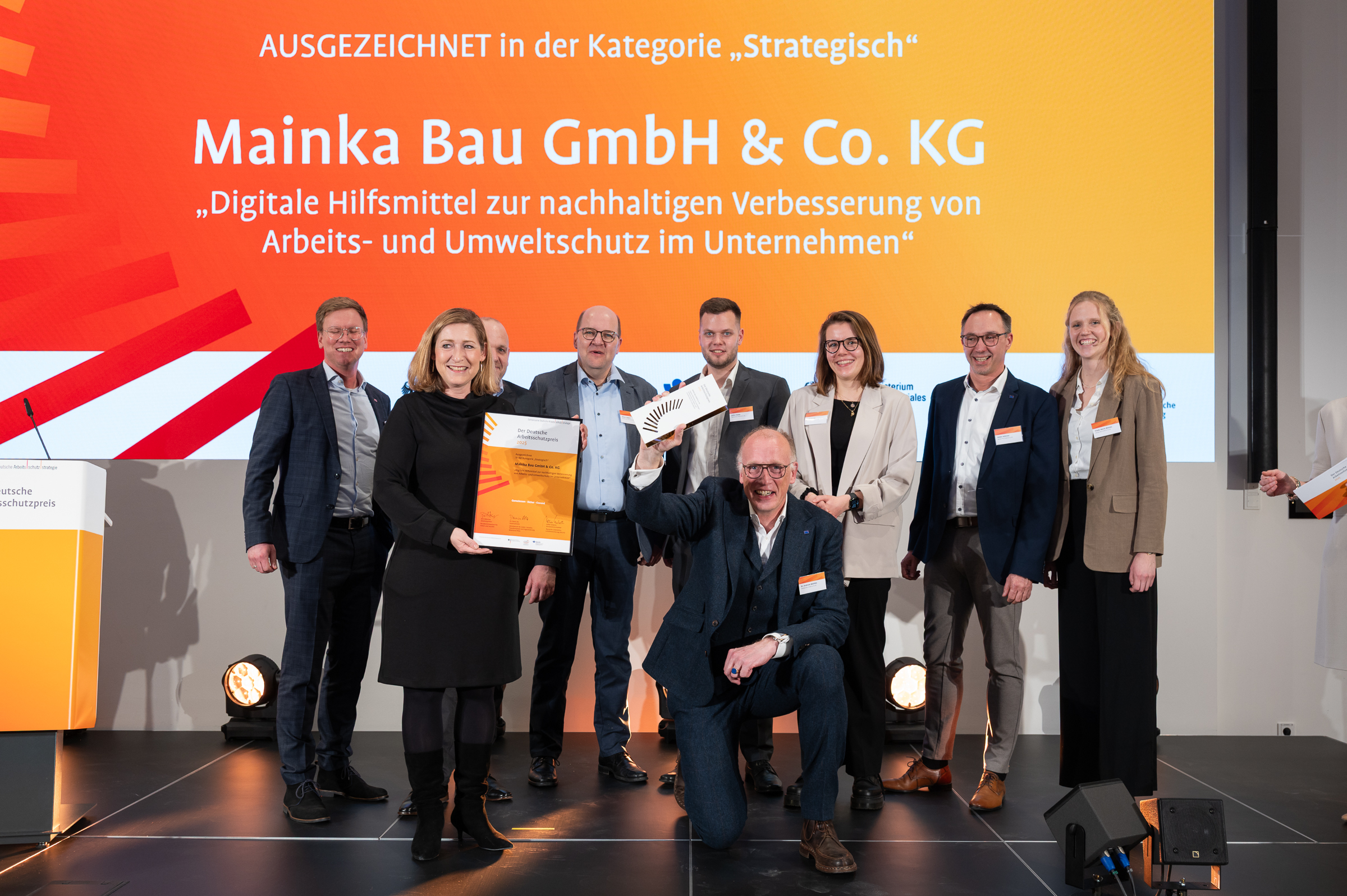 2025 ausgezeichnet in der Kategorie "Strategisch": Mainka Bau GmbH & Co. KG mit Laudatorin Lilian Tschan, Staatssekretärin im BMAS (Foto: DASP/J. Konrad Schmidt) Download Bild: Pressefoto der Vertreter*innen des ausgezeichneten Unternehmens mit Laudator*in -