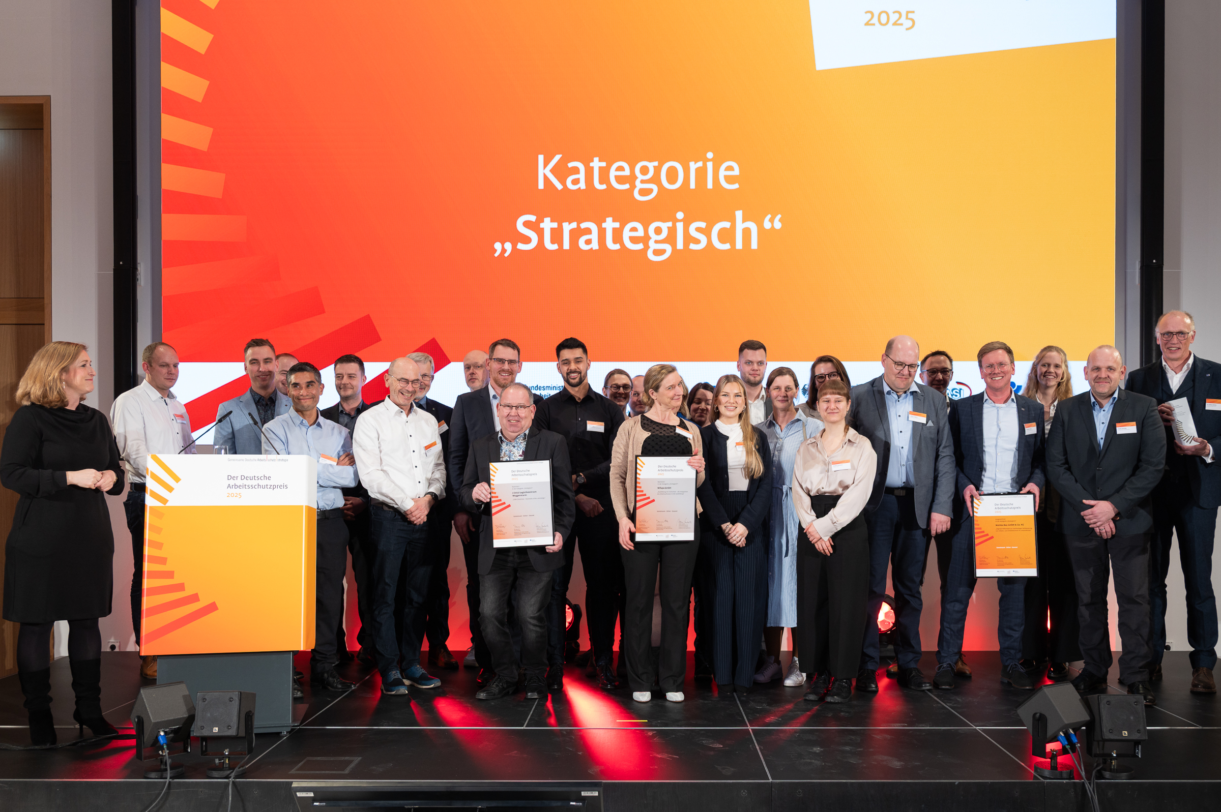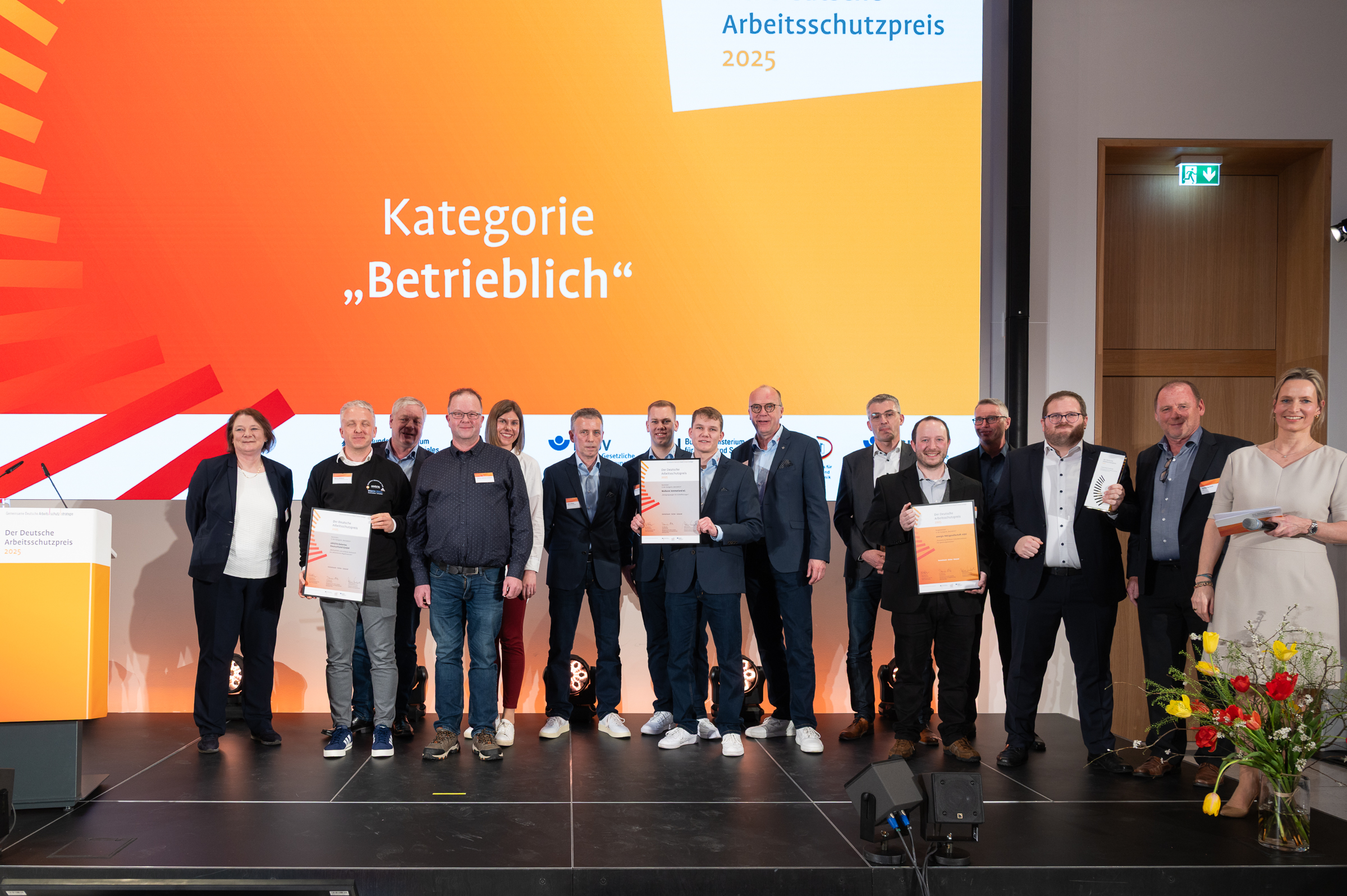Ausgezeichnete und nominierte Betriebe der Kategorie "Betrieblich": Mobile Haus-Krankenpflege Kröber GmbH, Biologische Heilmittel Heel GmbH und Mercer Timber Products GmbH mit Laudator Volker Enkerts, amtierender Vorstandsvorsitzender der DGUV (Foto: DASP/J. Konrad Schmidt) Download Bild: Vertreter*innen der ausgezeichneten und nominierten Unternehmen mit Laudator -