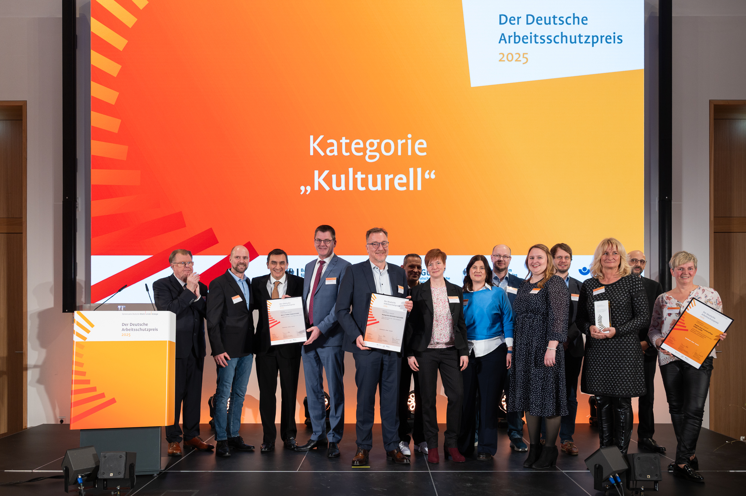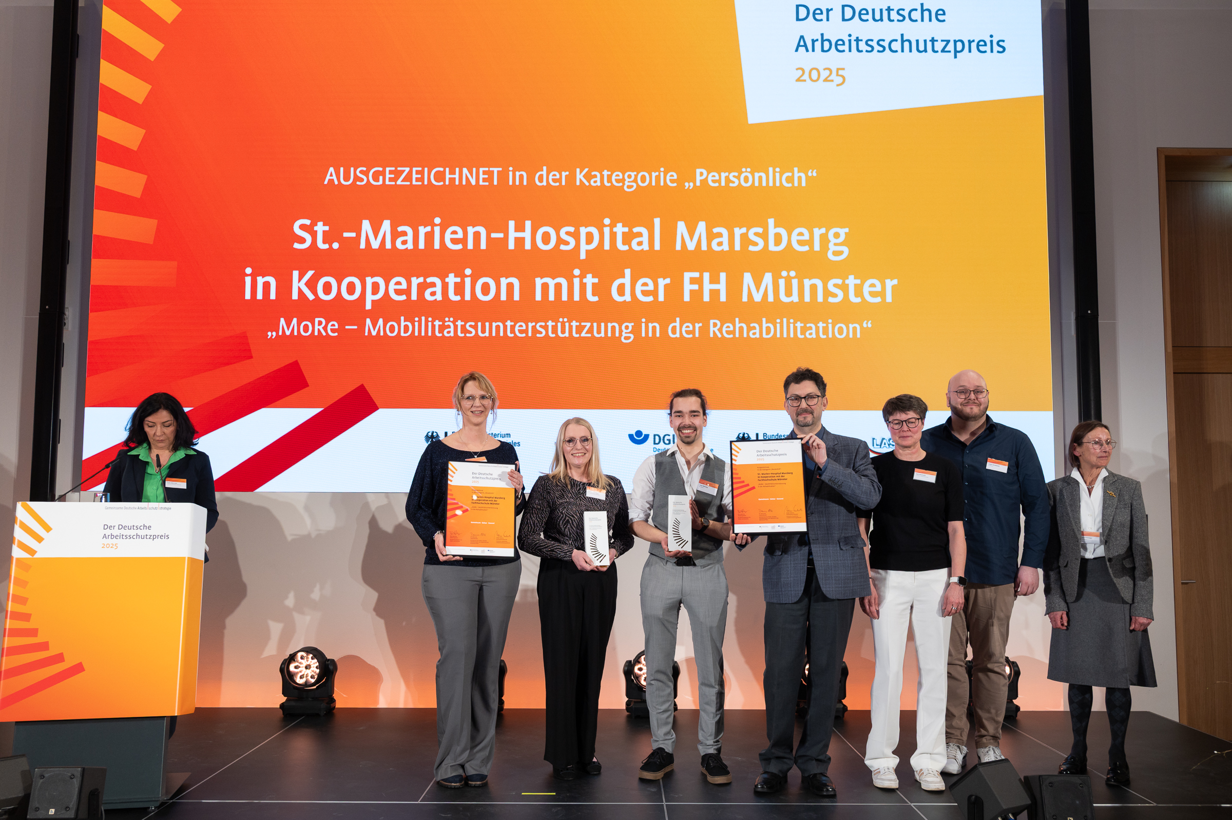 2025 ausgezeichnet in der Kategorie "Persönlich": St.-Marien-Hospital Marsberg in Kooperation mit der FH Münster mit Laudatorin Prof. Dr.-Ing. Anke Kahl, Inhaberin des Lehrstuhls Arbeitssicherheit an der Bergischen Universität Wuppertal (Foto: DASP/J. Konrad Schmidt) Download Bild: Pressefoto der Vertreter*innen des ausgezeichneten Unternehmens mit Laudator*in -