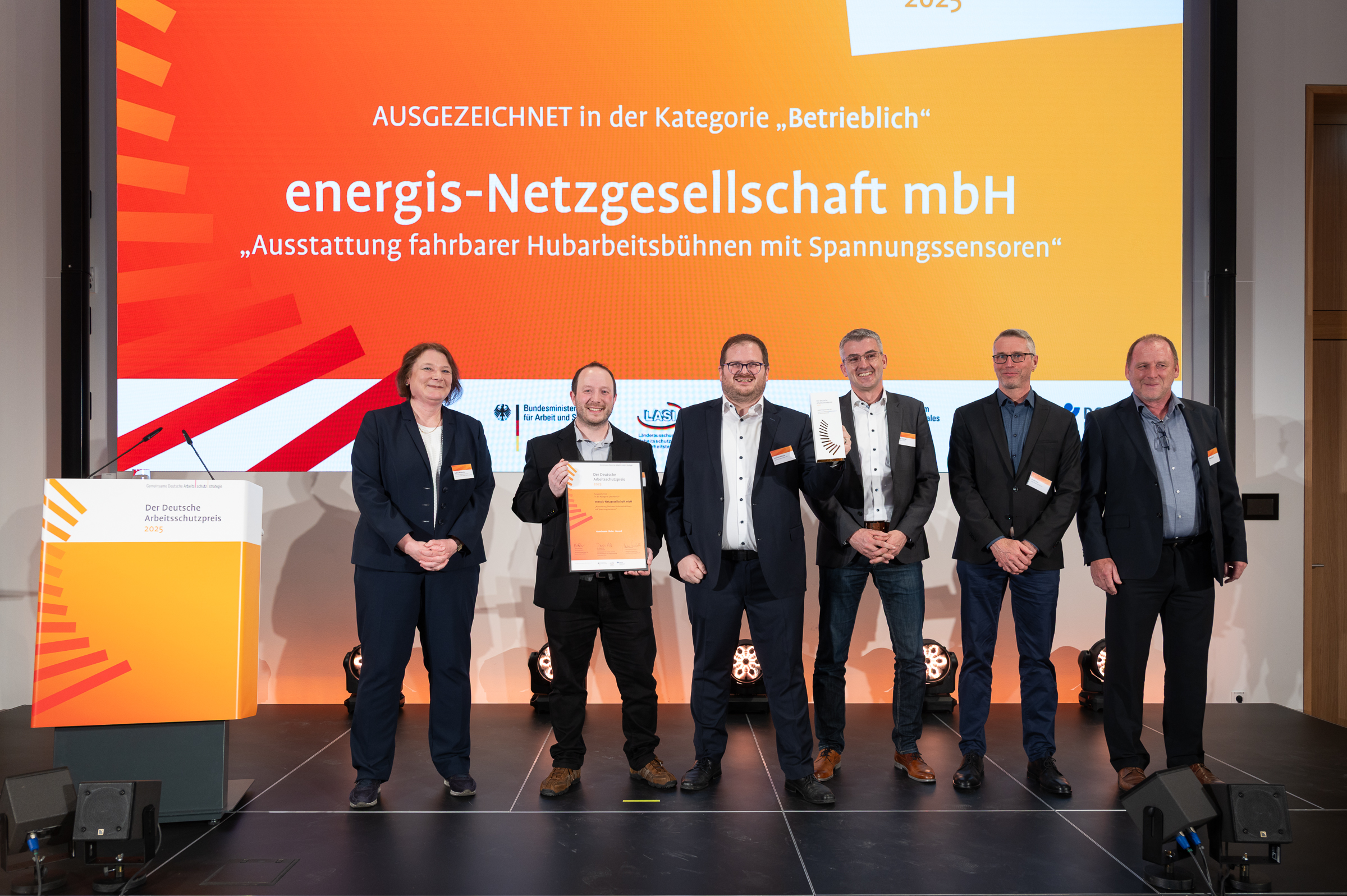 2025 ausgezeichnet in der Kategorie "Betrieblich": energis-Netzgesellschaft mbH mit Laudatorin Sabine Majehrke, LASI-Vorsitzende (Foto: DASP/J. Konrad Schmidt) Download Bild: Vertreter des ausgezeichneten Unternehmens mit Laudatorin -