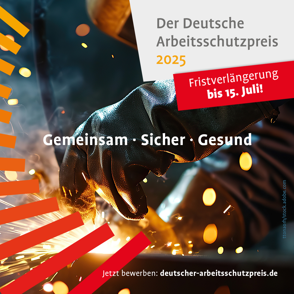 Quadratisches Keyvisual des DASP 2025 mit Störer "Fristverlängerung", Foto: ttonaorh/stock.adobe.com Download Bild: Quadratisches Keyvisual des Deutschen Arbeitsschutzpreises mit Logo und Claim: Gemeinsam. Sicher. Gesund., sowie Störer "Fristverlängerung". -