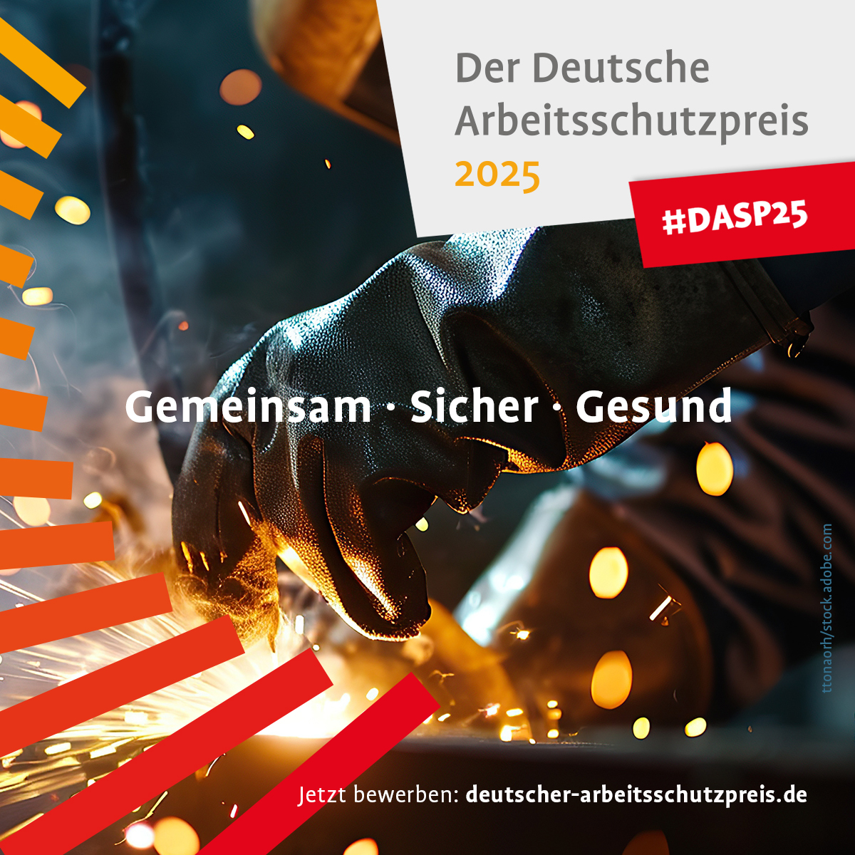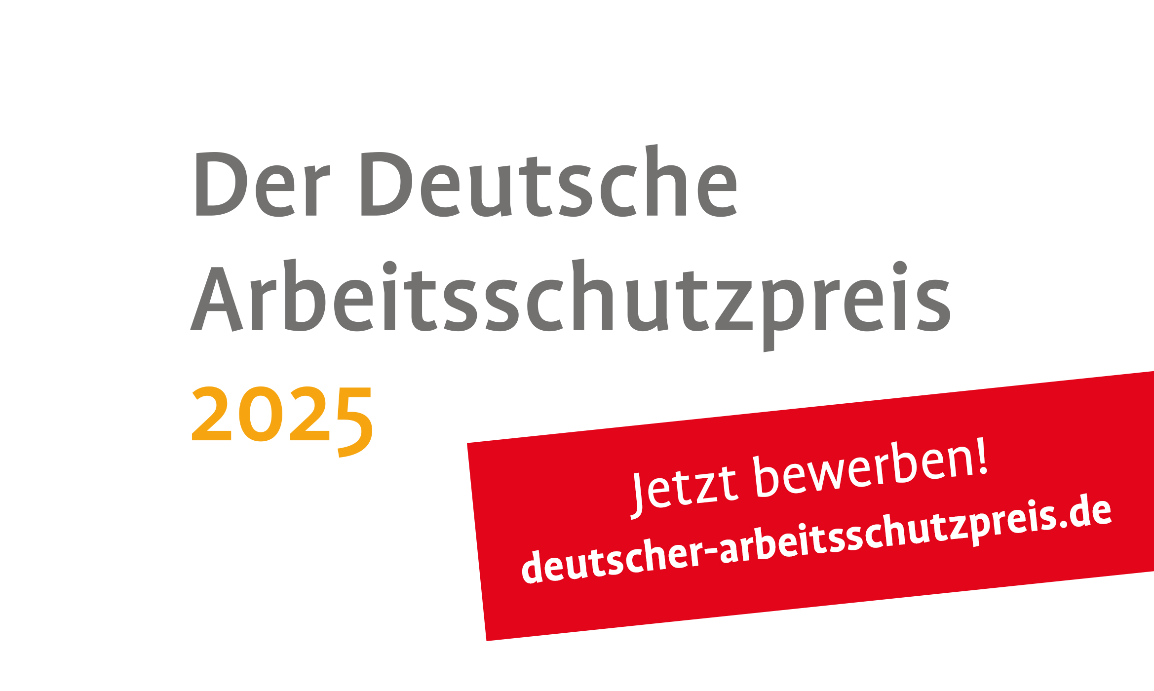 DASP-Logo mit Bewerbungsstörer Download Bild: Logo des Deutschen Arbeitsschutzpreises 2025 mit dem Hinweis Jetzt bewerben unter www.deutscher-arbeitsschutzpreis.de