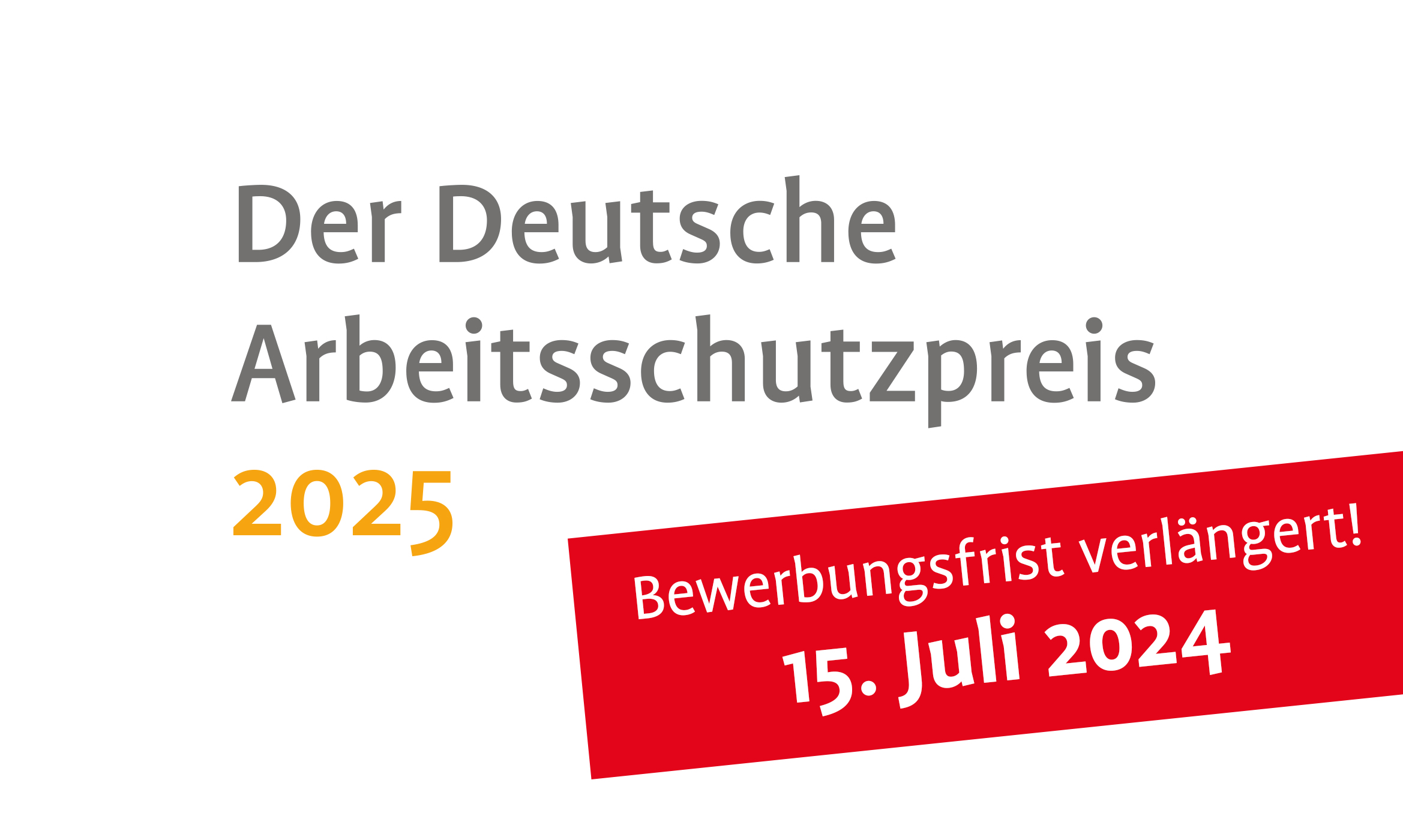DASP-Logo mit Störer "Bewerbungsfrist verlängert!" Download Bild: Logo des Deutschen Arbeitsschutzpreises 2025 mit dem Hinweis "Bewerbungsfrist verlängert!" -